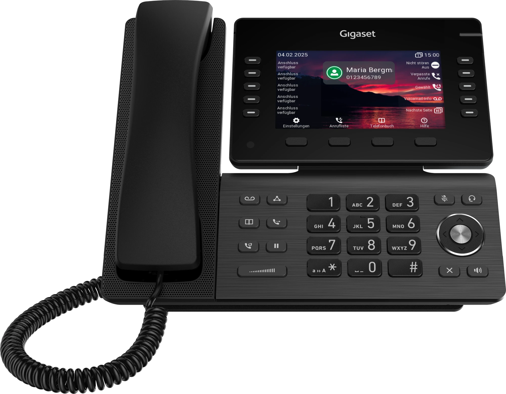 Das Gigaset DESK 600 verfügt über ein dreizeiliges LC-Display mit LED-Hintergrundbeleuchtung, das Rufnummer, Name,Gesprächszeit und VIP-Status (sofern zugeteilt) des Anrufers anzeigt. Der Startbildschirm informiert zudem über das Datum, die Uhrzeit und den Wochentag.
