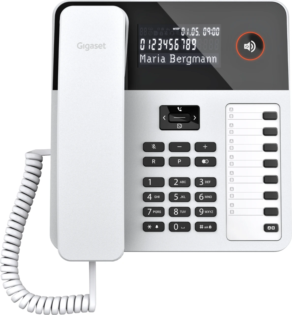 Das Gigaset DESK 600 verfügt über ein dreizeiliges LC-Display mit LED-Hintergrundbeleuchtung, das Rufnummer, Name,Gesprächszeit und VIP-Status (sofern zugeteilt) des Anrufers anzeigt. Der Startbildschirm informiert zudem über das Datum, die Uhrzeit und den Wochentag.